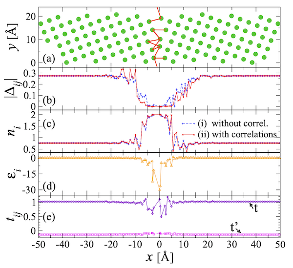 Using a phenomenological theory of superconductivity (Bogoliubov de Gennes), we showed how grain boundaries and strong correlations affect high-temperature superconductivity [P5].
